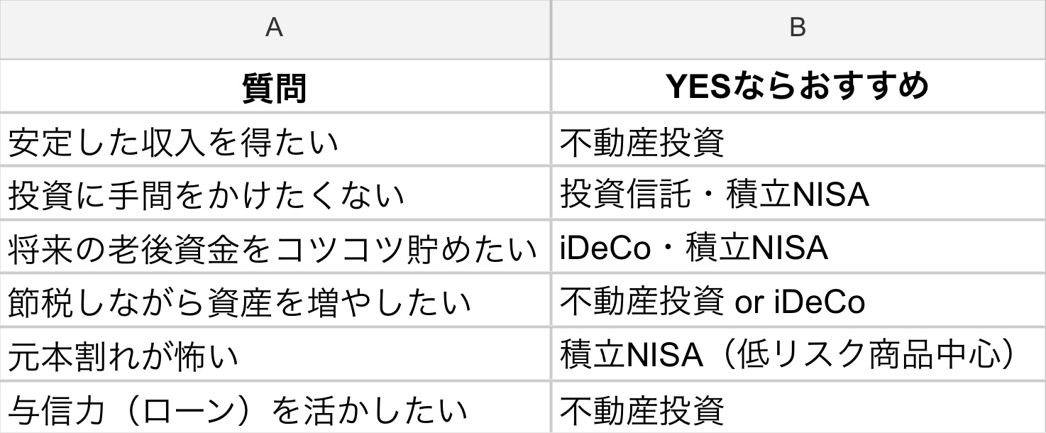 資産形成の目的によって最適な手段は変わります。