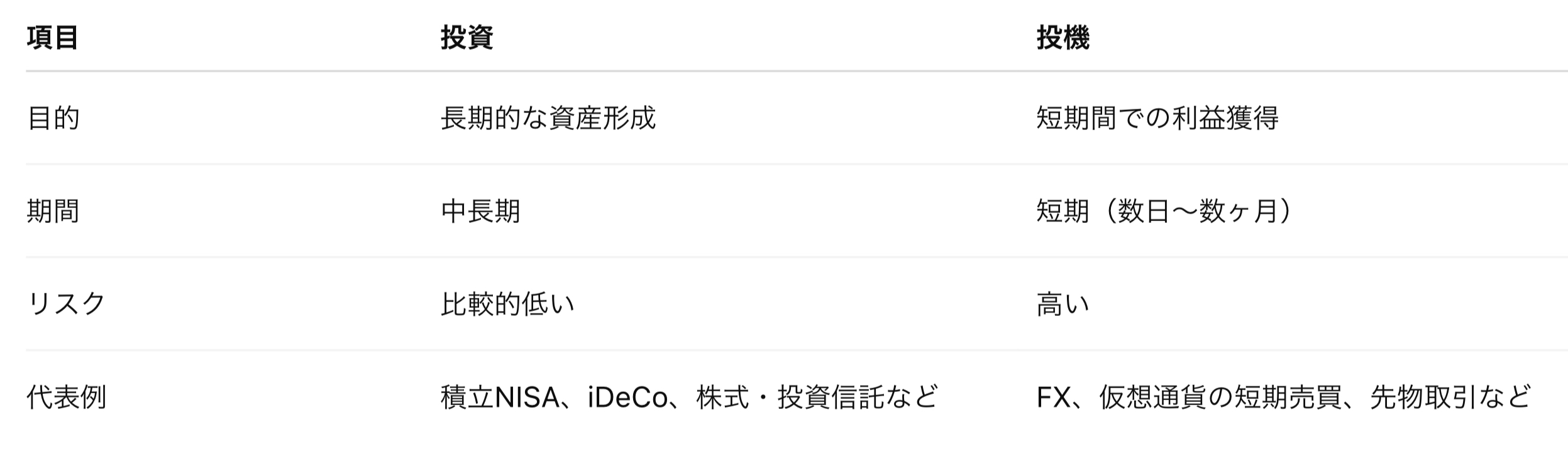 まず初めに、「投資」と「投機」はまったく別物だということを理解しておきましょう。どちらも「お金を使って増やす行動」には違いありませんが、その目的やリスクの性質が大きく異なります。